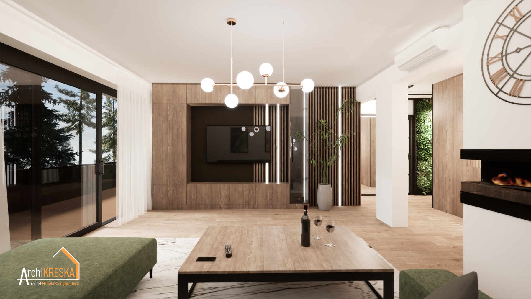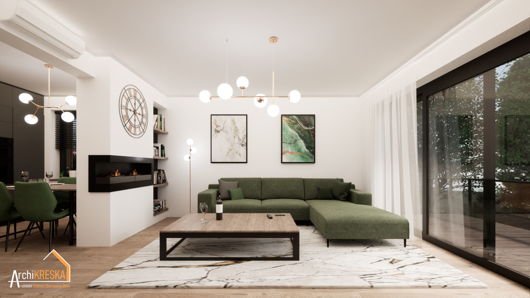 Projekt aranżacji pokoju dziennego o powierzchni ok. 20m2.