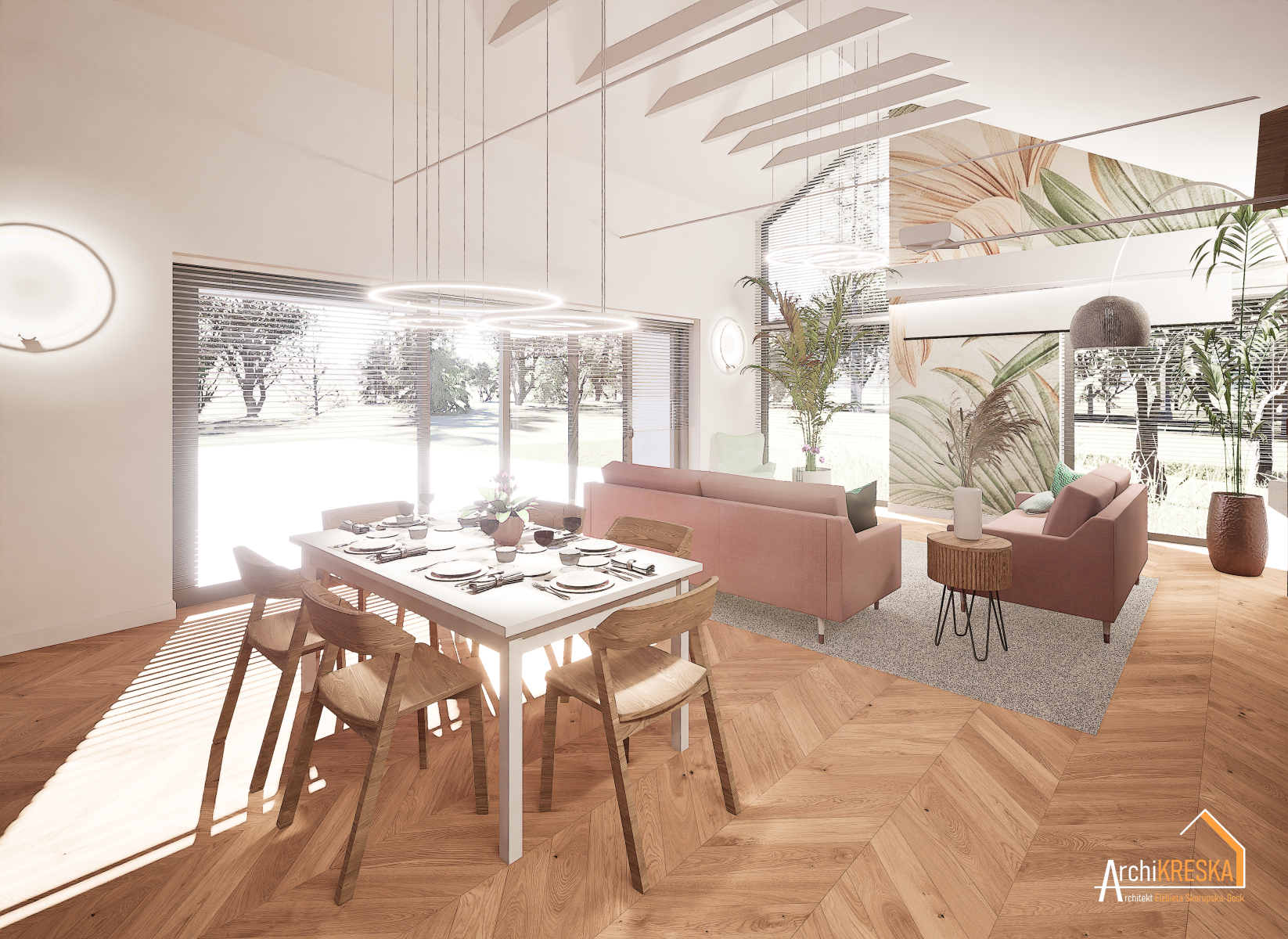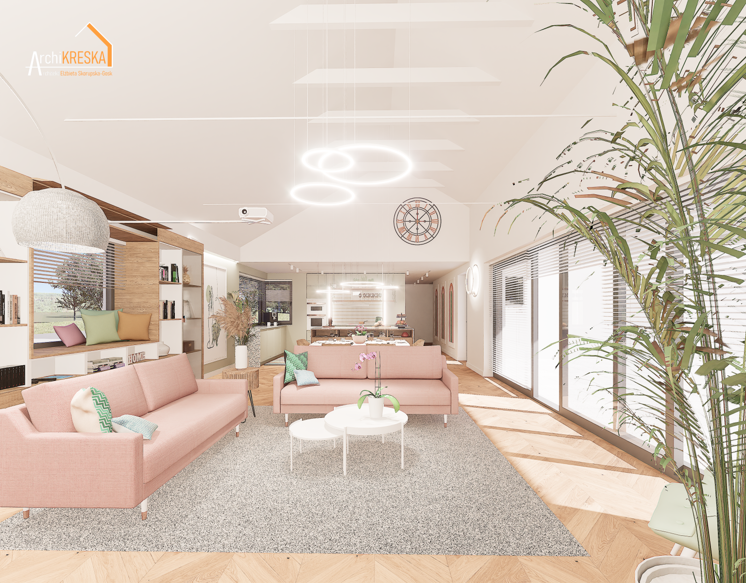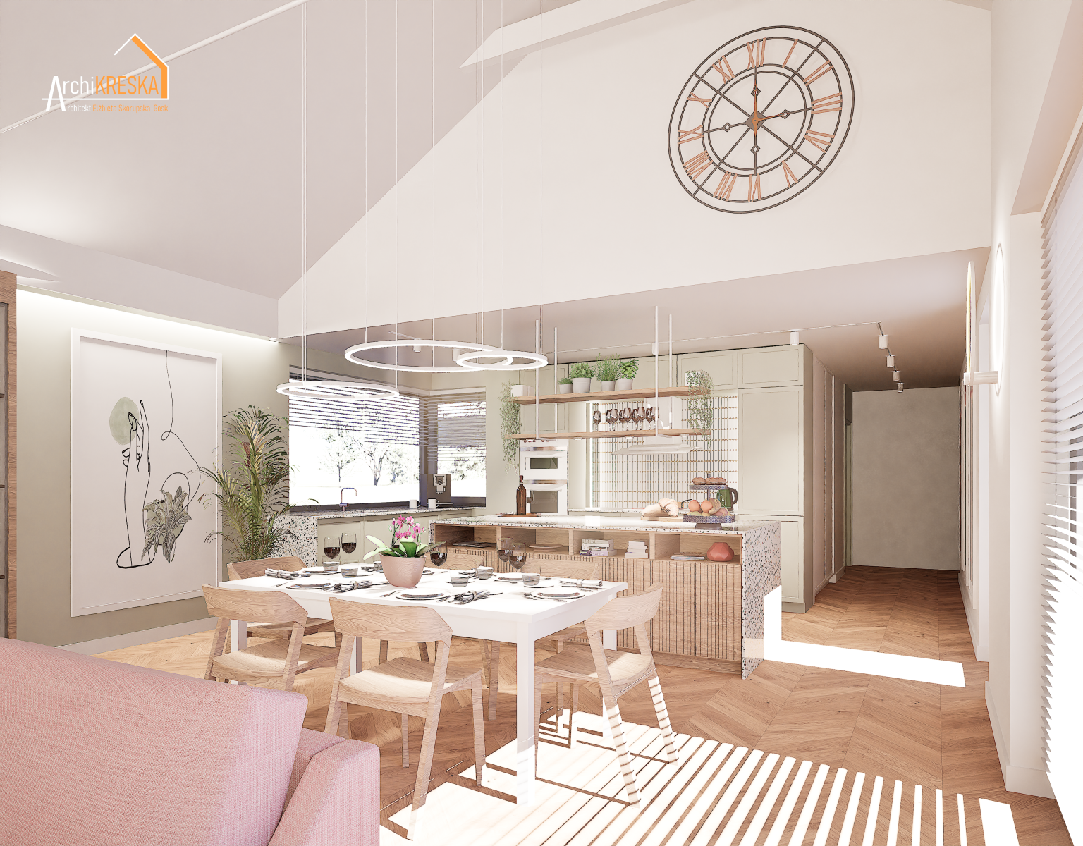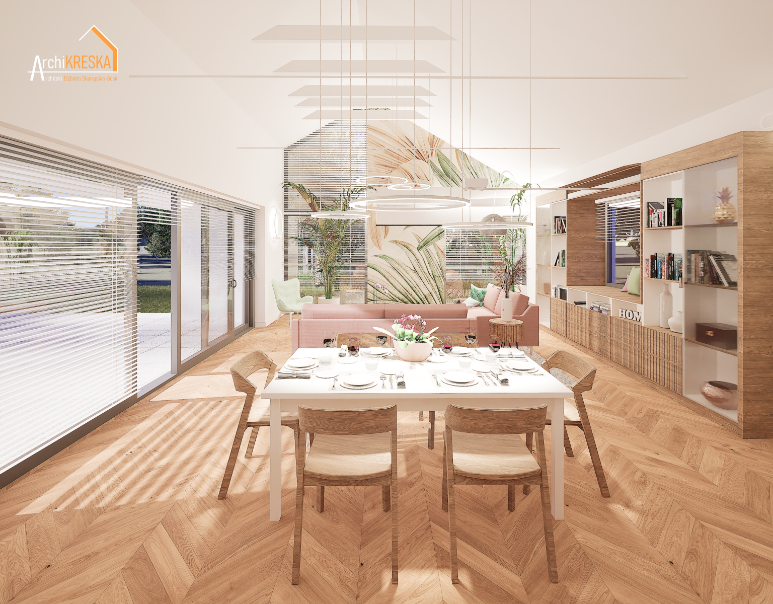 Projekt aranżacji salonu z jadalnią o powierzchni ok. 40m2.