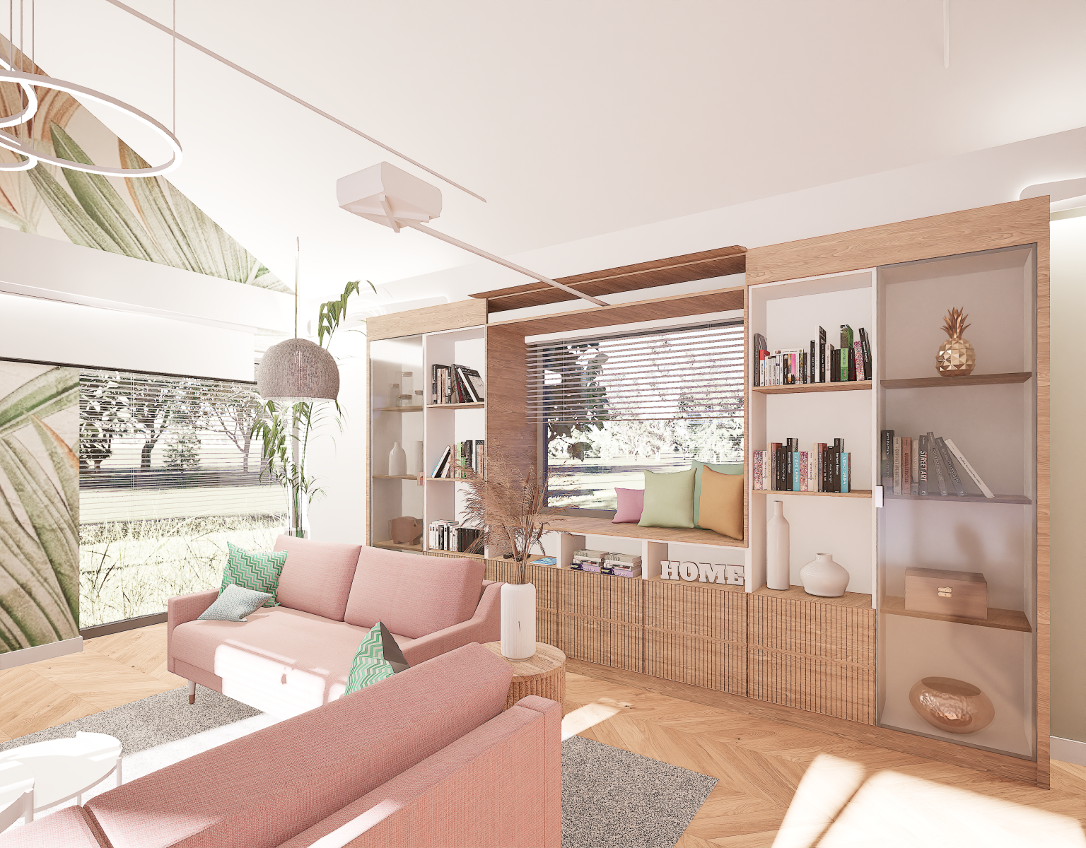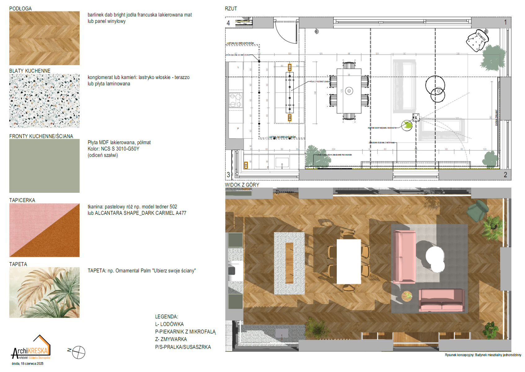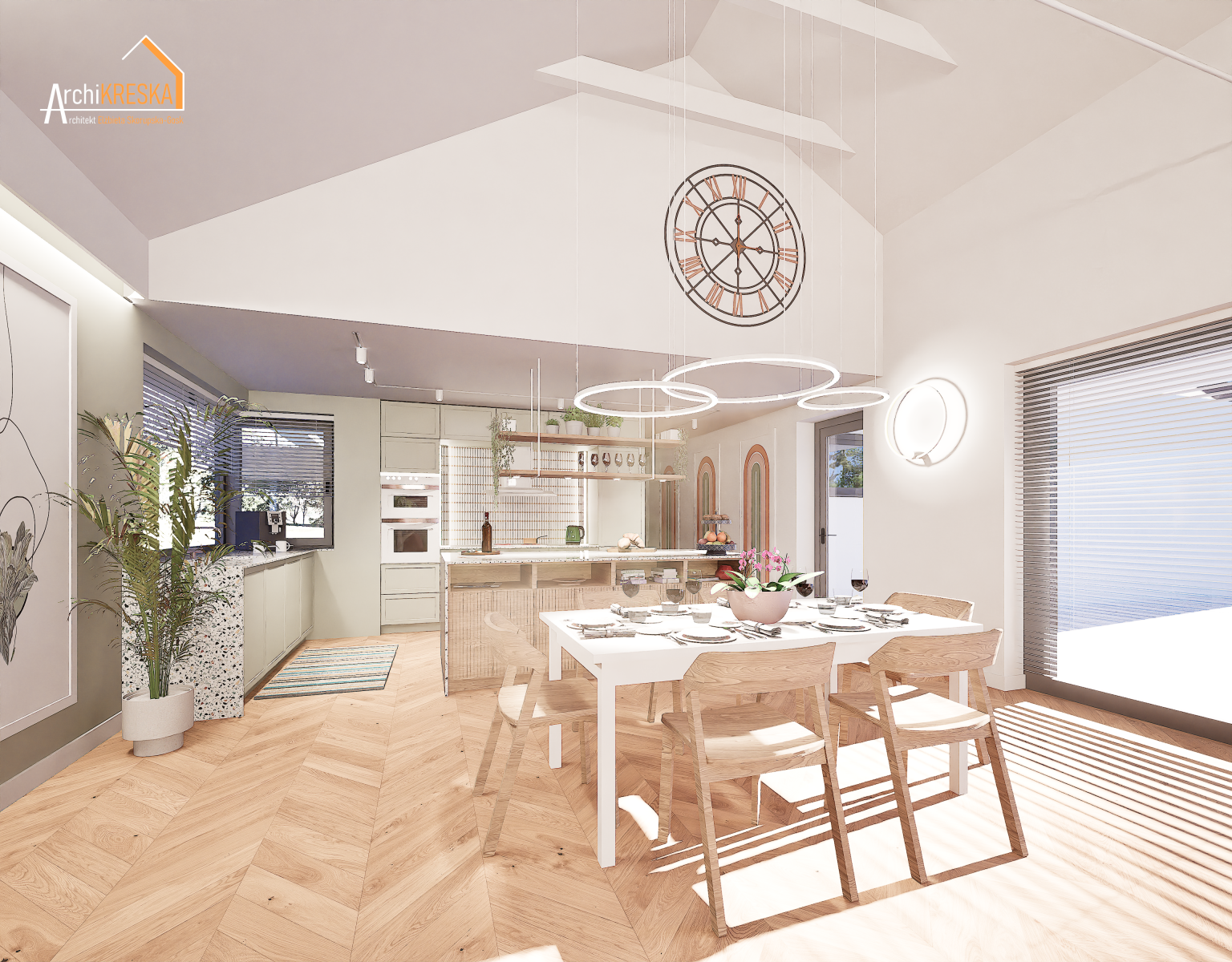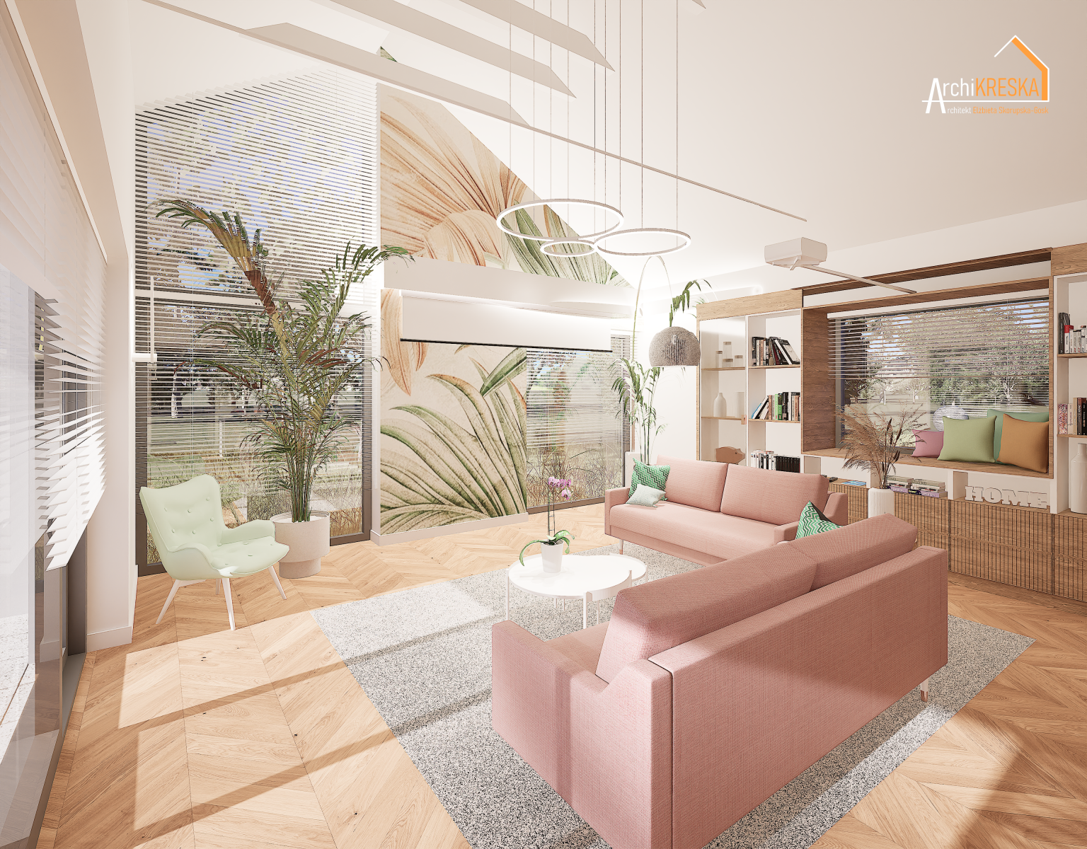 Projekt aranżacji salonu z jadalnią o powierzchni ok. 40m2.
