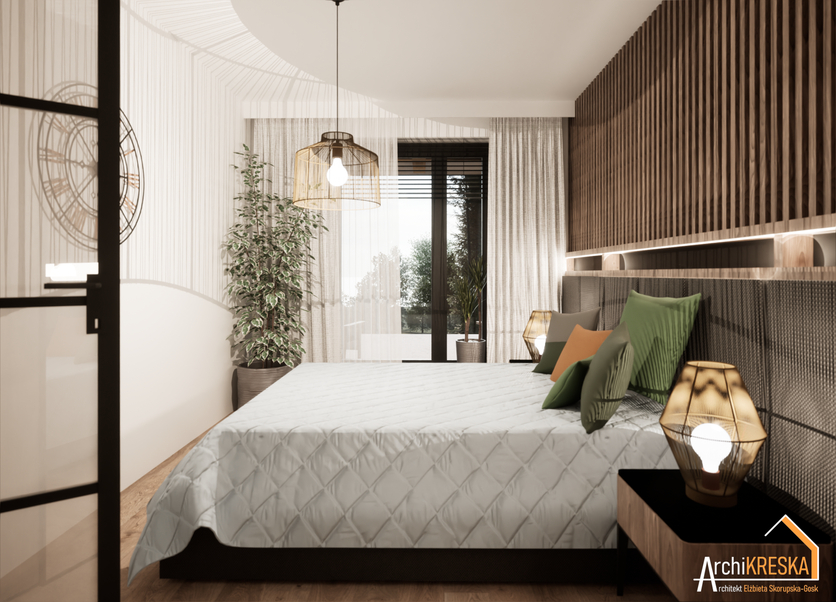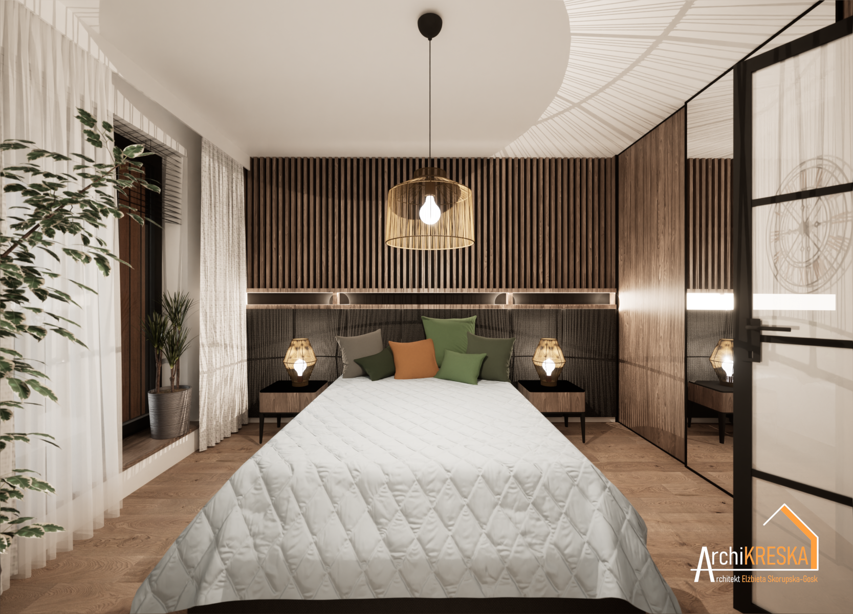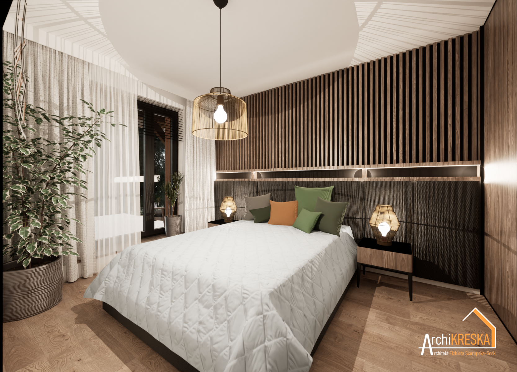 Projekt aranżacji sypialni o powierzchni ok. 11,5m2.